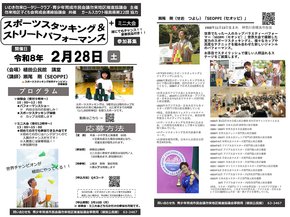 - 2026年2月28日(土)にスポーツスタッキング&ストリートパフォーマンスが開催されます。資料(PDF、1.2MB)を掲載しました。